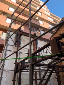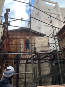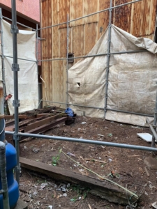 2階部分に人が乗るだけで建物が揺れて倒壊しそうでしたので足場を組み、